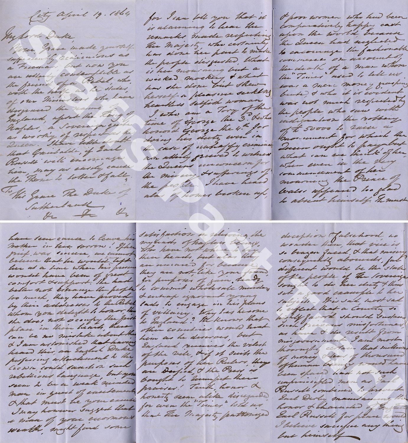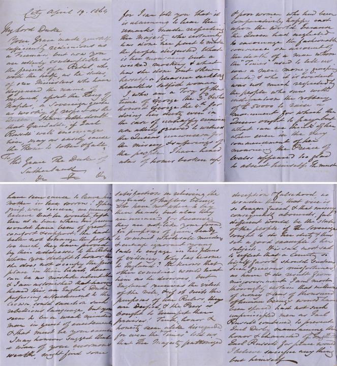 Description:However, numerous letters retained amongst the Duke’s papers, many anonymous, reveal that some people were opposed to Garibaldi’s visit. One anonymous letter dated April 19th 1864 refers to the Duke as ‘contemptible as the friend of a Rebel’. The letter describes those who have offered Garibaldi ‘help’ as having ‘disgraced the name of England’. The writer goes on to criticise the conduct of Queen Victoria, commenting ‘I can tell you that it is alarming to hear the remarks made respecting Her Majesty, who certainly has done her part to make the people disgusted.’ The vitriolic letter asks ‘what is her mourning but a wicked mockery’ stating that the Queen has shown herself to be ‘a pleasure seeking heartless selfish woman’. In addition to his criticisms of the Queen, the writer refers to Prince Albert as ‘a man whom the “Times” used to tell us was a mere money grasping brute’, before calling the Duke of Sutherland ‘a weak minded man’, and expressing cynicism over the Duke’s ‘enormous wealth’. The writer concludes his letter by referring to Garibaldi’s plans as ‘villainy’, asking ‘why has he come to England?’. He concludes ‘England receives the vilest of the vile’.